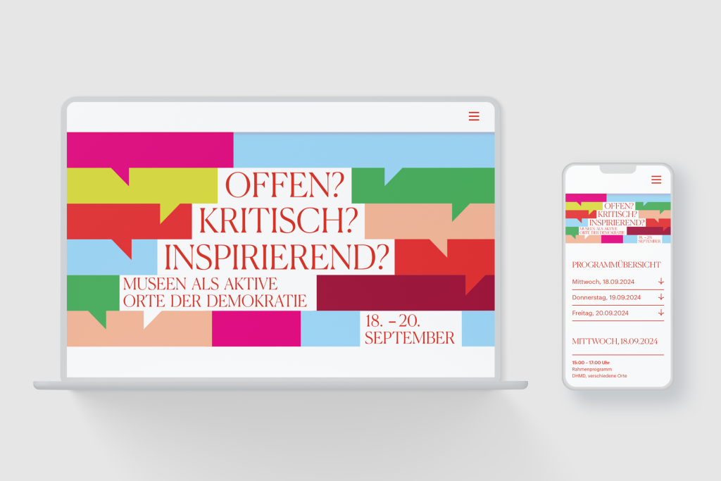 Museen als Resonanzräume der Demokratie – für das Deutsche Hygiene-Museum Dresden (DHMD) entwickelten wir das visuelle und digitale Erscheinungsbild einer Tagung, die nicht nur Ergebnisse präsentiert, sondern Diskurs ermöglicht. Vielstimmigkeit, Reibung, Perspektivenvielfalt: Das Key Visual übersetzt demokratische Prozesse in starke Farben und markante Typografie. Die Website wird zur Plattform für Austausch, Übersicht und Beteiligung – mit Bewerbungstool, Livestream und Projekteinblicken. So wird sichtbar, was Demokratie im Museum bedeuten kann: Haltung zeigen, Stimmen hörbar machen, Räume öffnen.