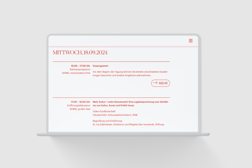 Vielstimmigkeit und Pluralismus sind zentrale Merkmale der Demokratie. Das Key Visual greift diese Themen auf: Mit ausdrucksstarken Farben und einer starken Typografie haben wir das Aufeinanderprallen verschiedener Meinungen in der Gesellschaft und die Notwendigkeit des Diskurses in der Demokratie visualisiert. Die Website der Tagung erfüllt dabei drei Funktionen: Als Kampagnenplattform fordert sie zuerst Interessierte zur Bewerbung auf. Zweitens bietet sie eine Programmübersicht und einen Livestream während der Tagung. Drittens präsentiert sie das Vorhaben der Kooperation und stellt alle laufenden Einzelprojekte vor.