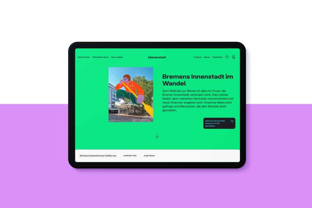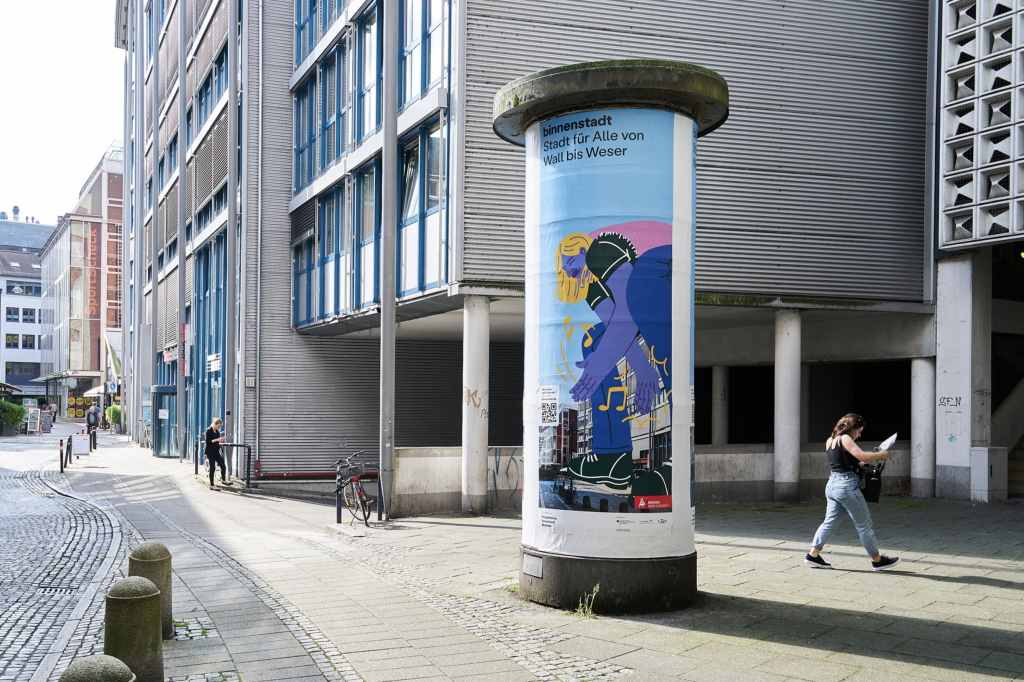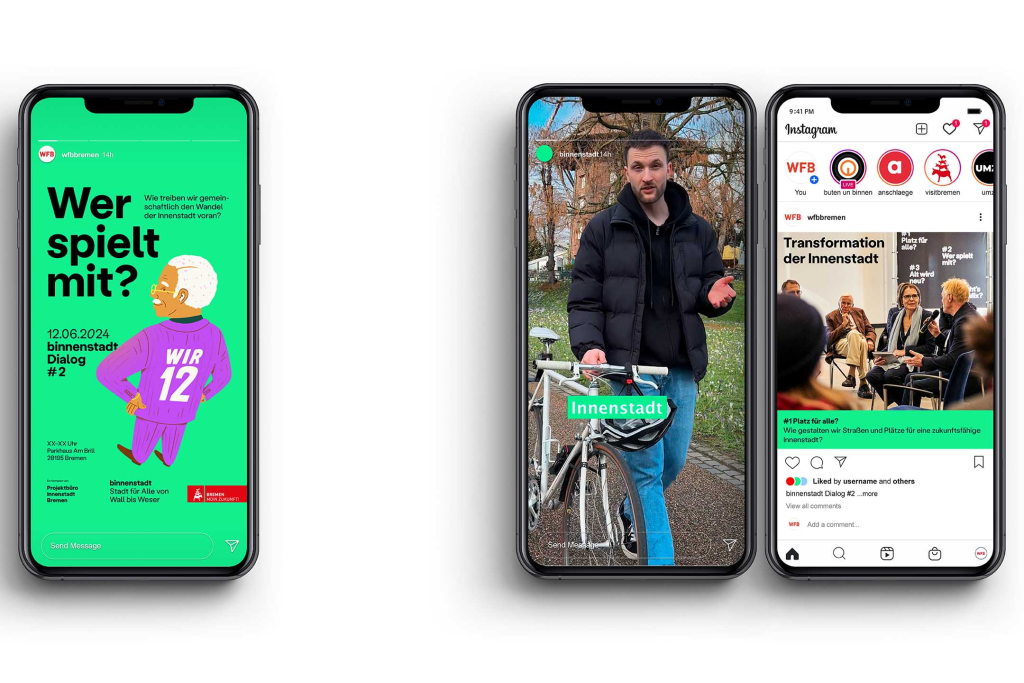 Im Auftrag der Stadt Bremen koordiniert das Projektbüro Innenstadt Maßnahmen zur Transformation der Bremer Innenstadt zwischen Wallanlagen und Weserufer. Gemeinsam mit dessen Team und einer Allianz aus städtischen Partnern entwickelten wir eine Kommunikationsstrategie, die Bremer:innen Lust und Mut auf Veränderung macht und sichtbar werden lässt: Nicht alles ist schlecht, vieles wird schon umgesetzt, umso mehr ist in Planung für eine Bremer Innenstadt, die für alle etwas bereithält.