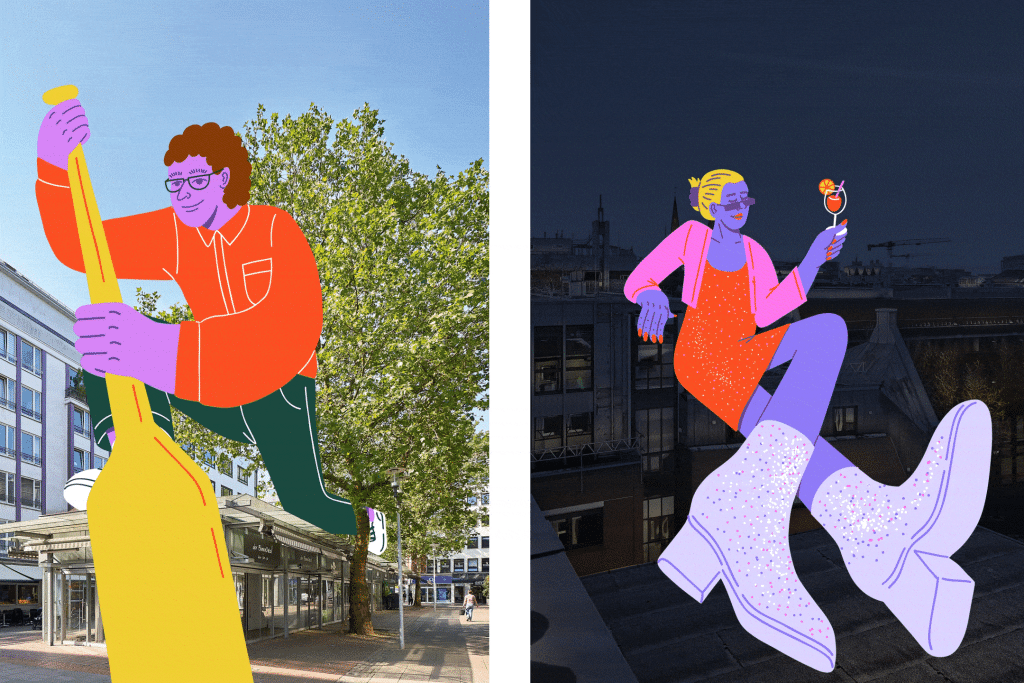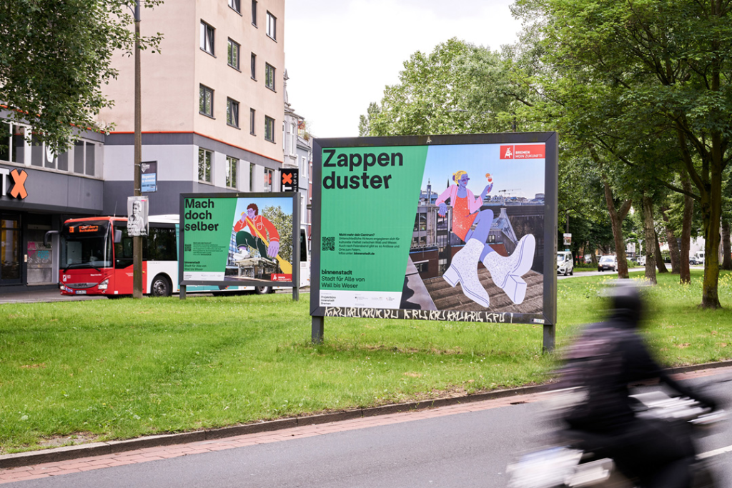 Bei der Gestaltung der Kampagne war es unser Ziel, die Kraft der einzelnen Akteure mit lokalen Orten zu verbinden, die der Transformation unterliegen. Fotomontagen von bekannten und weniger bekannten Orten der Bremer Innenstadt bilden eine visuelle Verbindung mit illustrierten Figuren. Hierfür wurden Architekturfotografien von Christian Burmester mit Figurenentwürfen von Viktoria Cichón kombiniert. Die „Transformers“ stehen für die neue Nutzungsvielfalt im Transformationsprozess und können hier Eigentümer:in, dort Bürger:in oder Unternehmer:in sein.