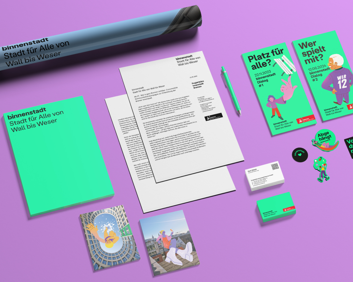 „Buten un binnen, wagen un winnen“ – das Motto der Bremer Kaufleute, das wie die Bremer Stadtmusikanten, Werder Bremen oder der Dom die Identität der Stadt prägt – war Ausgangspunkt für die Entwicklung der Untermarke binnenstadt. Der Untertitel „Stadt für alle von Wall bis Weser“ grenzt die Ziele Vielfalt, Aufenthaltsqualität und Flächengerechtigkeit auf den Bereich im Herzen der Stadt ein.