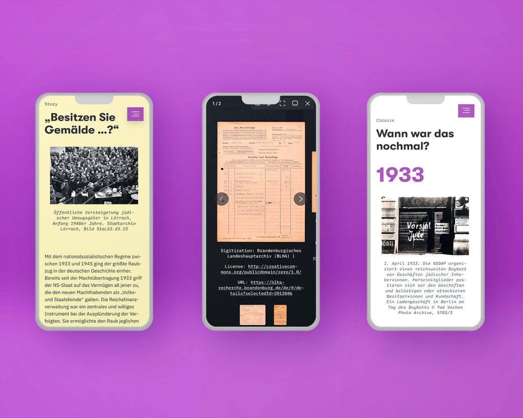 Das Regime der Nationalsozialist:innen war sehr sorgfältig darin, ihre eigenen Taten zu dokumentieren. Das Brandenburgische Landeshauptarchiv hat 42.000 Akten der Finanzverwaltung Berlin-Brandenburg digitalisiert und die Provenienz von zahlreichen enteigneten Kunstgegenständen aus dem Besitz von enteigneten, deportierten und ermordeten Berliner Jüdinnen und Juden erforscht. anschlaege hat in Zusammenarbeit dem dem Forschungsteam die Ergebnisse anhand von sechs exemplarischen Fällen in einer Online-Ausstellung nacherzählt und international zugänglich gemacht.